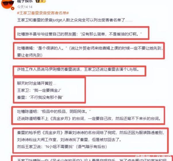 录音事件、“靠山”存疑 这一切起因都要从王家卫说起,因为他的一系列操作让作为编剧的古二坐不住了,站出来在公众视野前展开了激情对线。 最后实在是气不过的古二爆出了个大的,直接公布了王家卫和秦雯的录音,却不想这一行为将很多的明星纷纷卷了进去。