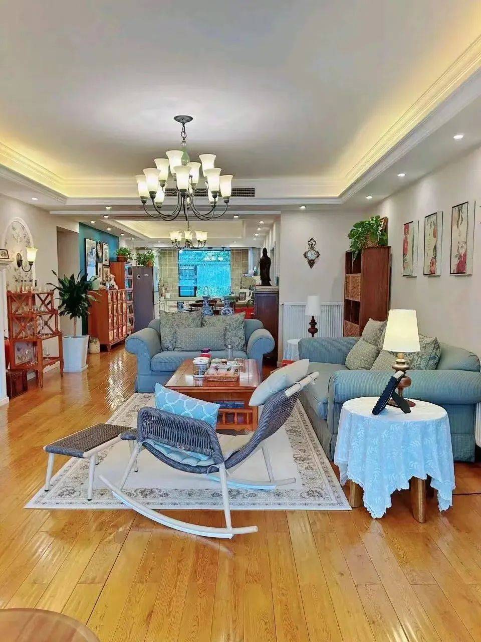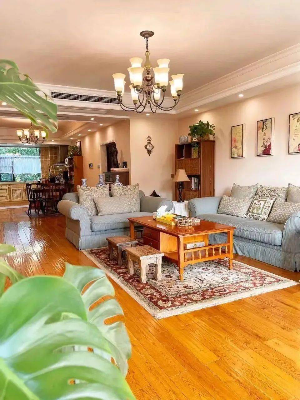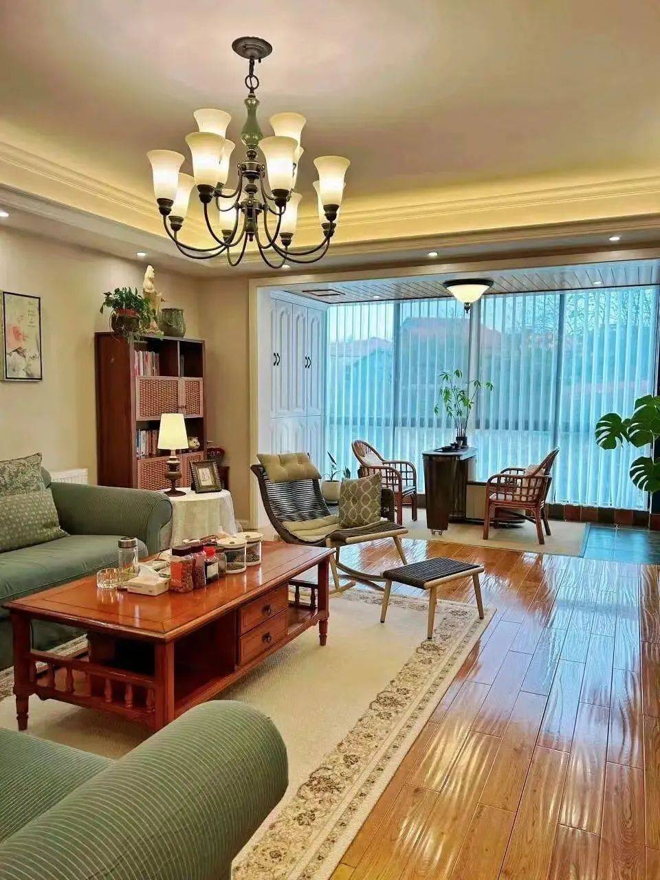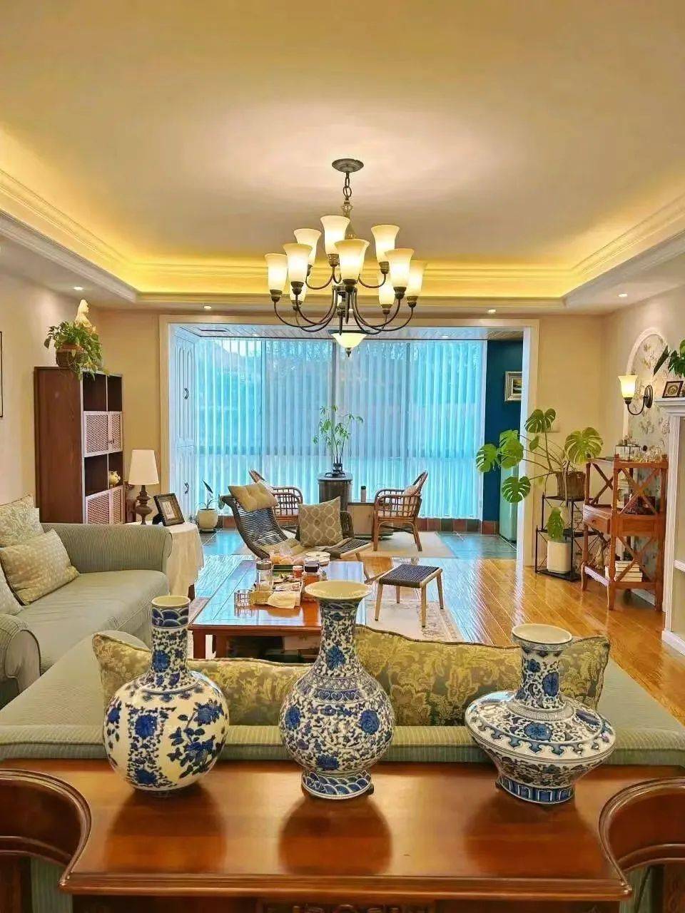 吊灯依然是视觉焦点,其复古而优雅的设计,配合天花板的隐藏灯带,营造出温馨而柔和的光环境。