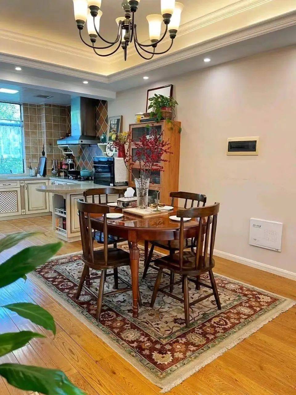 餐桌下方的地毯以复古花纹为主,深红与米色的交织,既保护了地板,又增添了装饰效果。