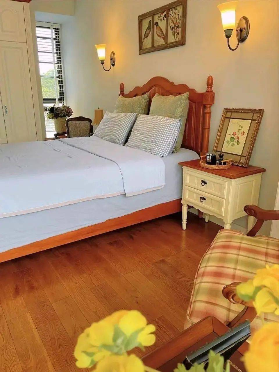 墙上的装饰画以花卉为主题,色调柔和,与整体风格高度协调,提升了空间的艺术氛围。