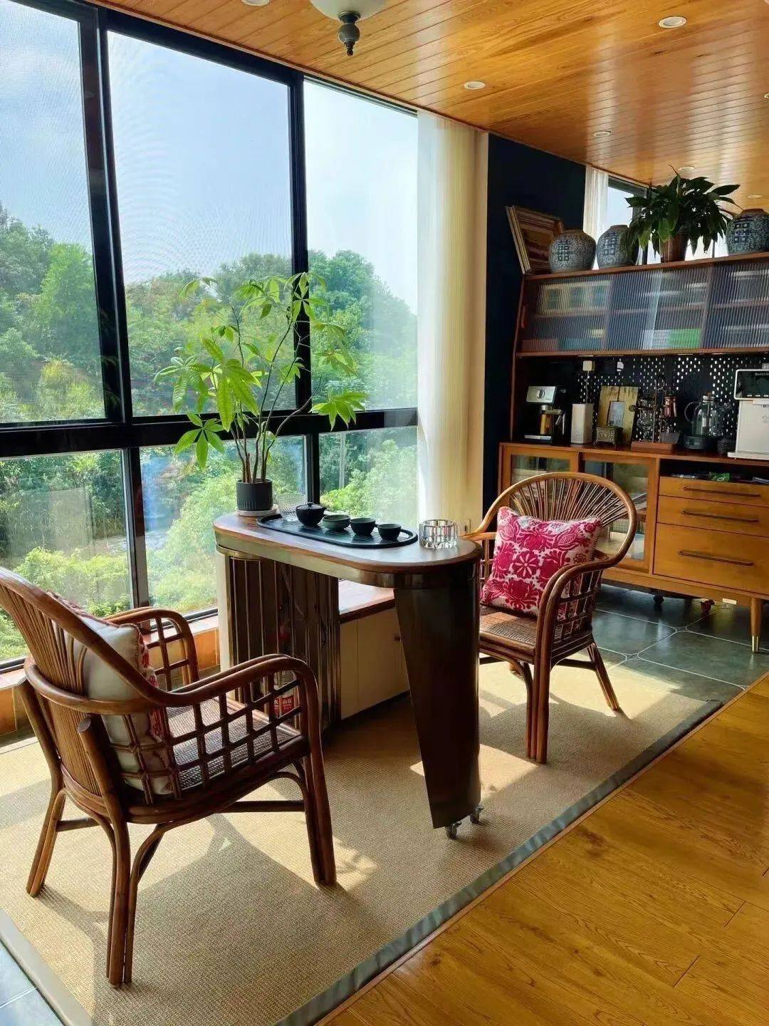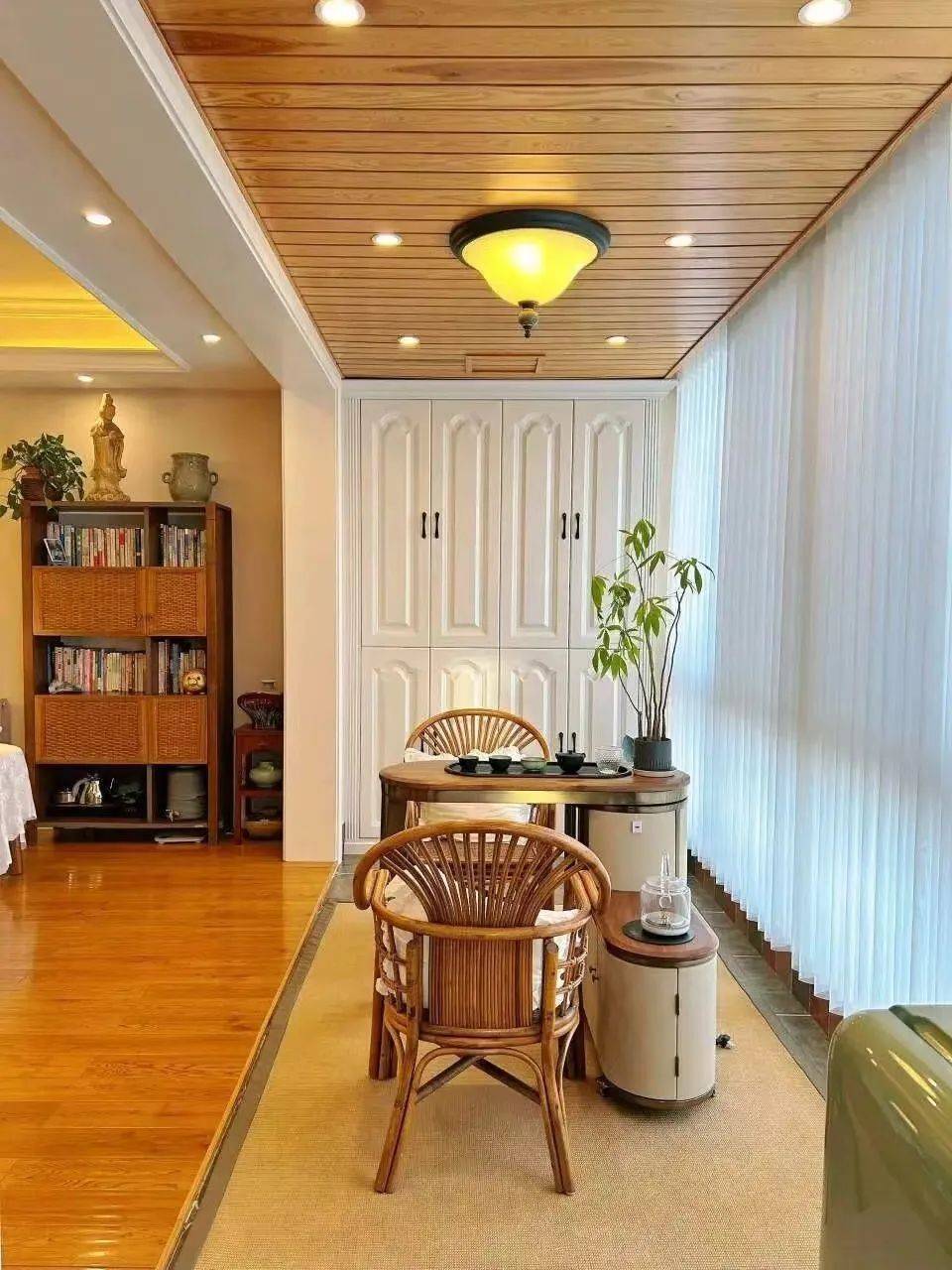 阳台上,一张格子图案的扶手椅与一张小木桌形成了一个舒适的休闲角落。阳台的地面铺设了木质地板,延续了房间内的温暖色调。