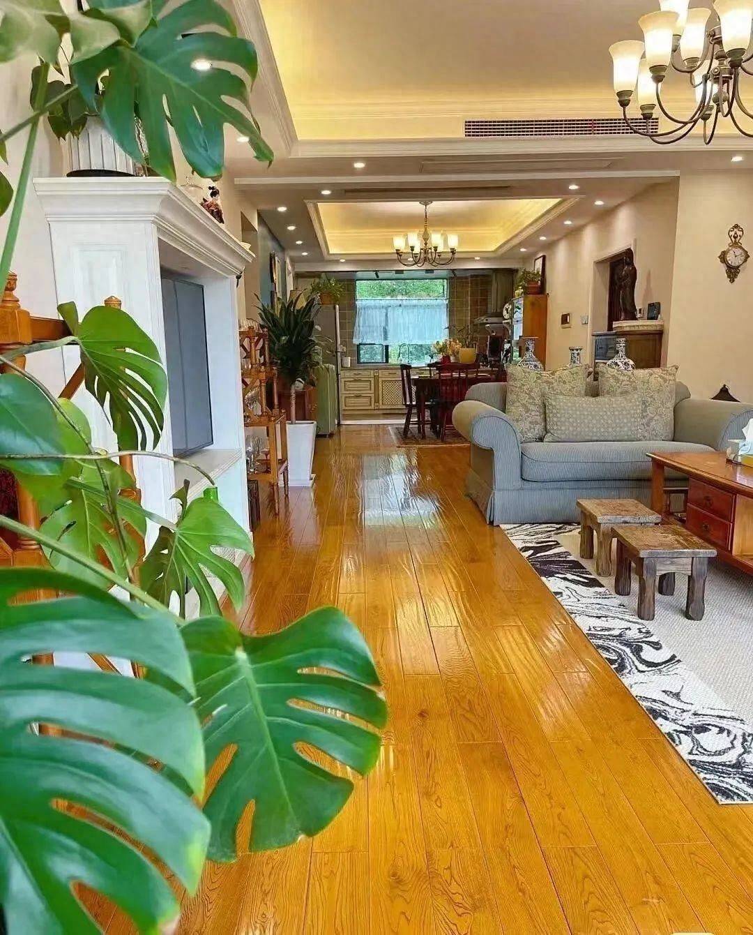 客厅里浓密翠绿的龟背竹叶片带来了一丝热带雨林的气息,叶片边缘的自然裂隙增添了视觉趣味。