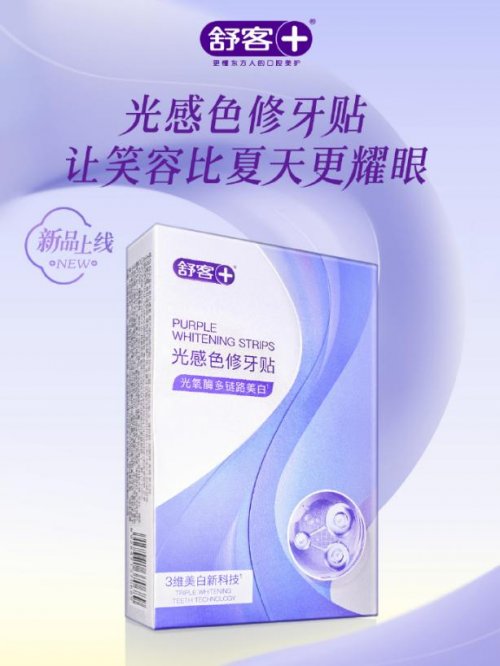 舒客色修美白牙贴,采用三明治网格干贴专利技术,紧密贴合牙缝与牙龈线,30分钟内释放万亿活氧炫白因子与科研级色修精华,通过“以紫修黄”的光学原理,1次使用即可实现349%的去黄提亮效果,7天提升5个美白色阶。产品特别添加活性抗敏因子,搭配专用缓释技术,在强效美白的同时舒缓牙齿敏感,解决了传统美白产品刺激性强的痛点。