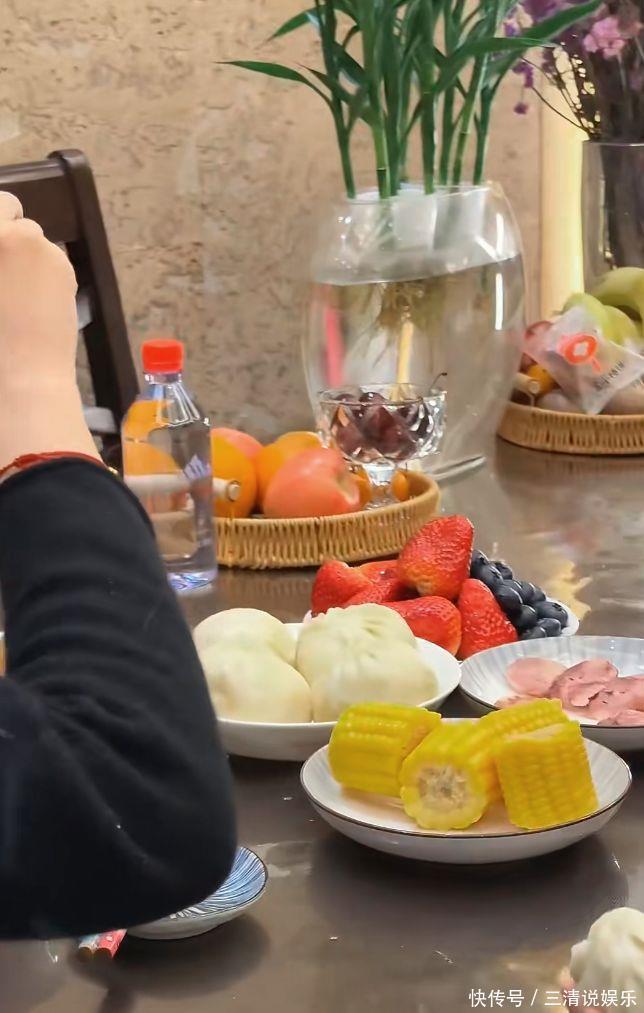 早餐桌上,玉米、包子、草莓、蓝莓、香肠一应俱全,儿子站在一旁介绍:“这个玉米是妈妈直播带货的。”有人说,这哪是带娃,分明是娃在带她。