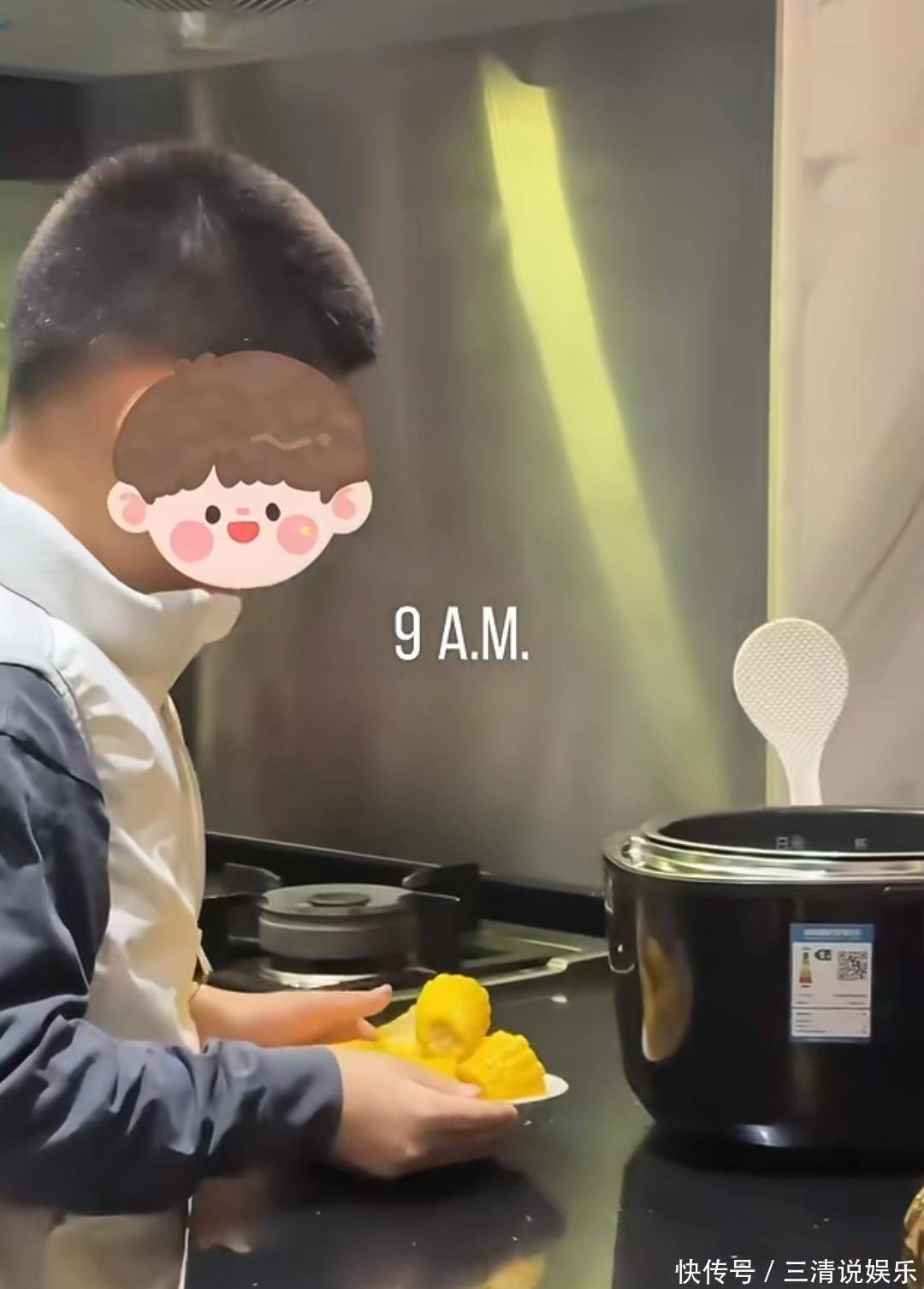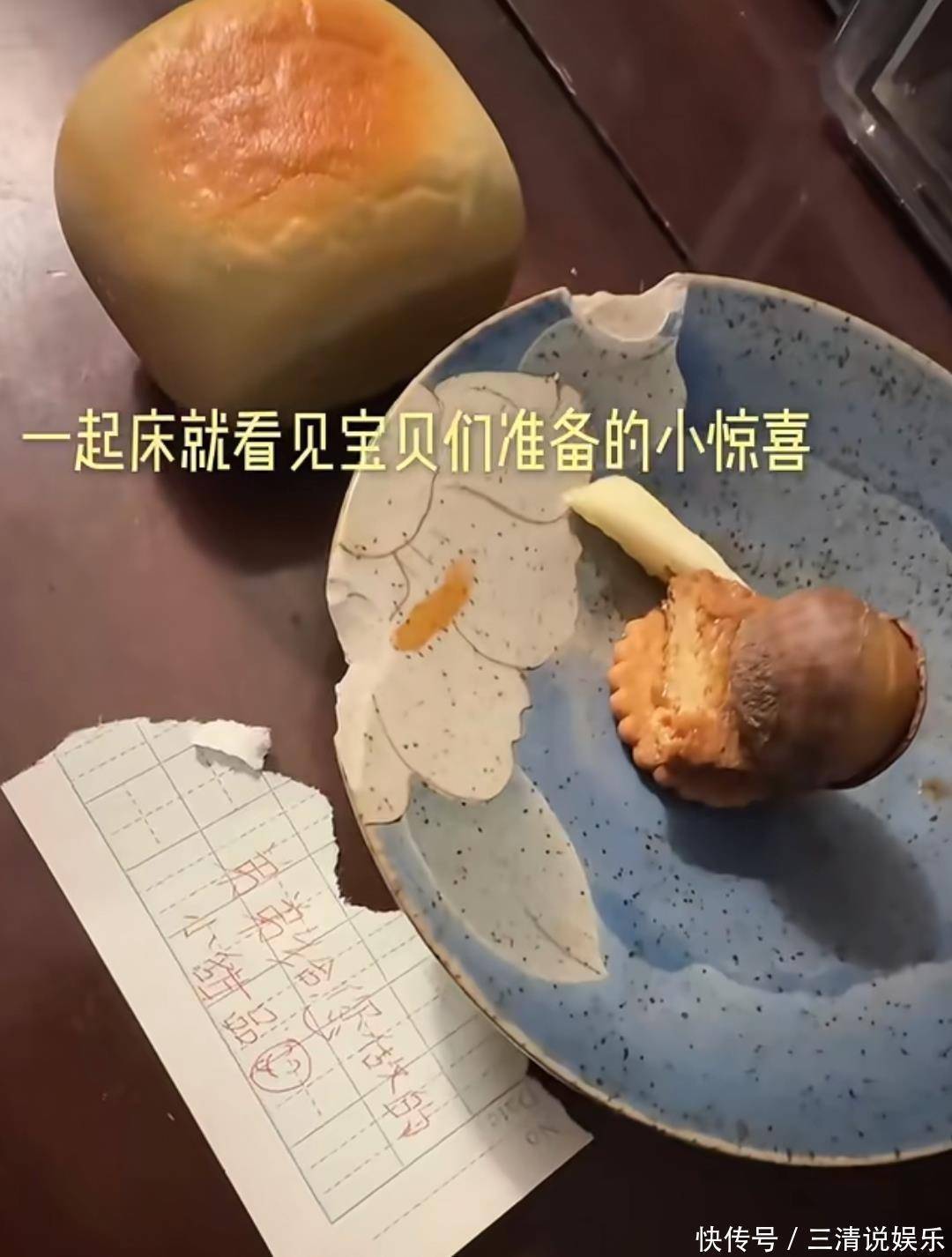从早上七点起床开始,剧情就引人入胜。一家三口同睡一张床,儿子第一个起床,蹑手蹑脚地下床去厨房,煮了玉米,还做了个小甜品,贴心地留了张纸条写着:“弟弟给您做的小甜品”。